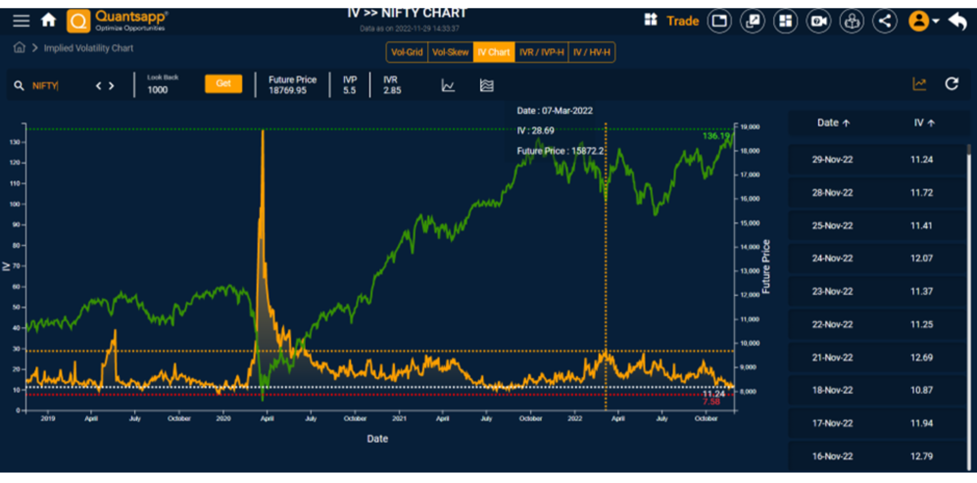 Implied Volatility Rank compares the current IV of the underlying (Nifty, Bank Nifty or F&O stocks) to its IV range over a pre-defined look-back period. If the number of trading days is assumed to be about 250 as a look-back period, corresponding to approximately, a year. So, the IVR takes into account the high and low of those 250 days and then compares the positioning of current IV, within that defined range.