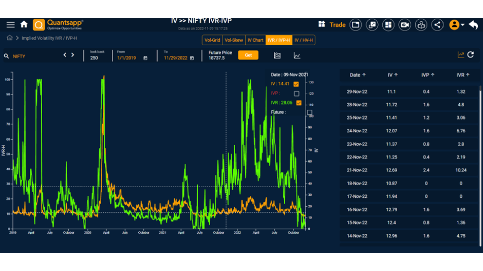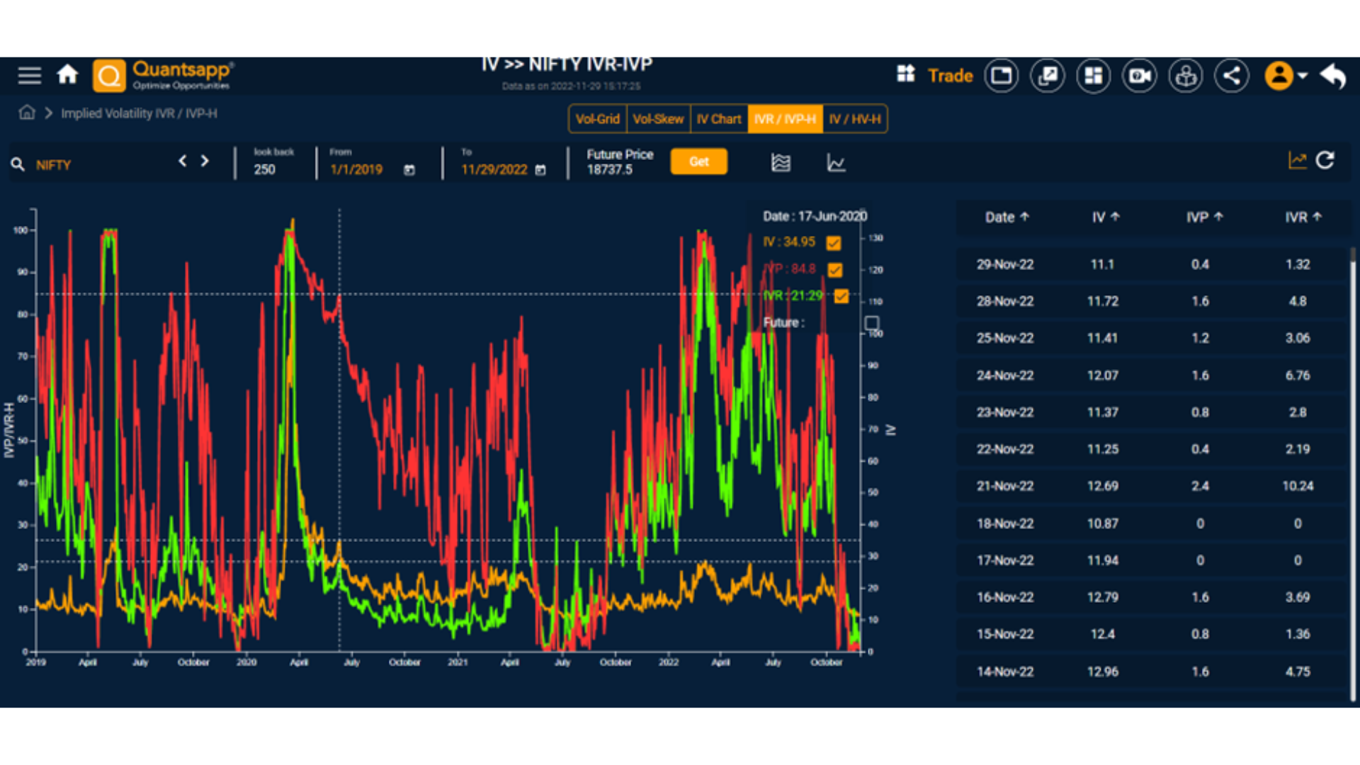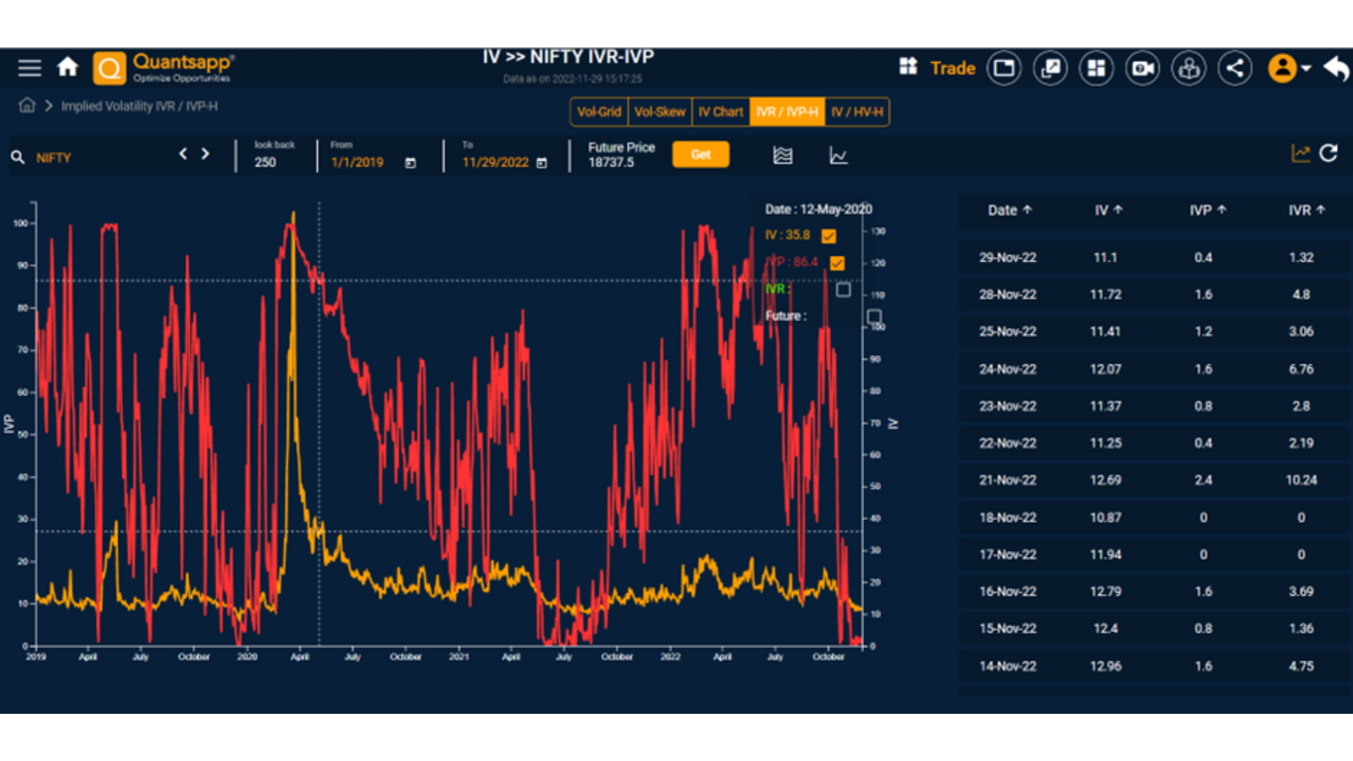 IVR and IVP help in finding the positioning of IV amidst historical lookback period. Is it on the higher end of the mean reverting range or lower end? IVR and IVP help in answering the question posed and also help in identifying volatility extremes.