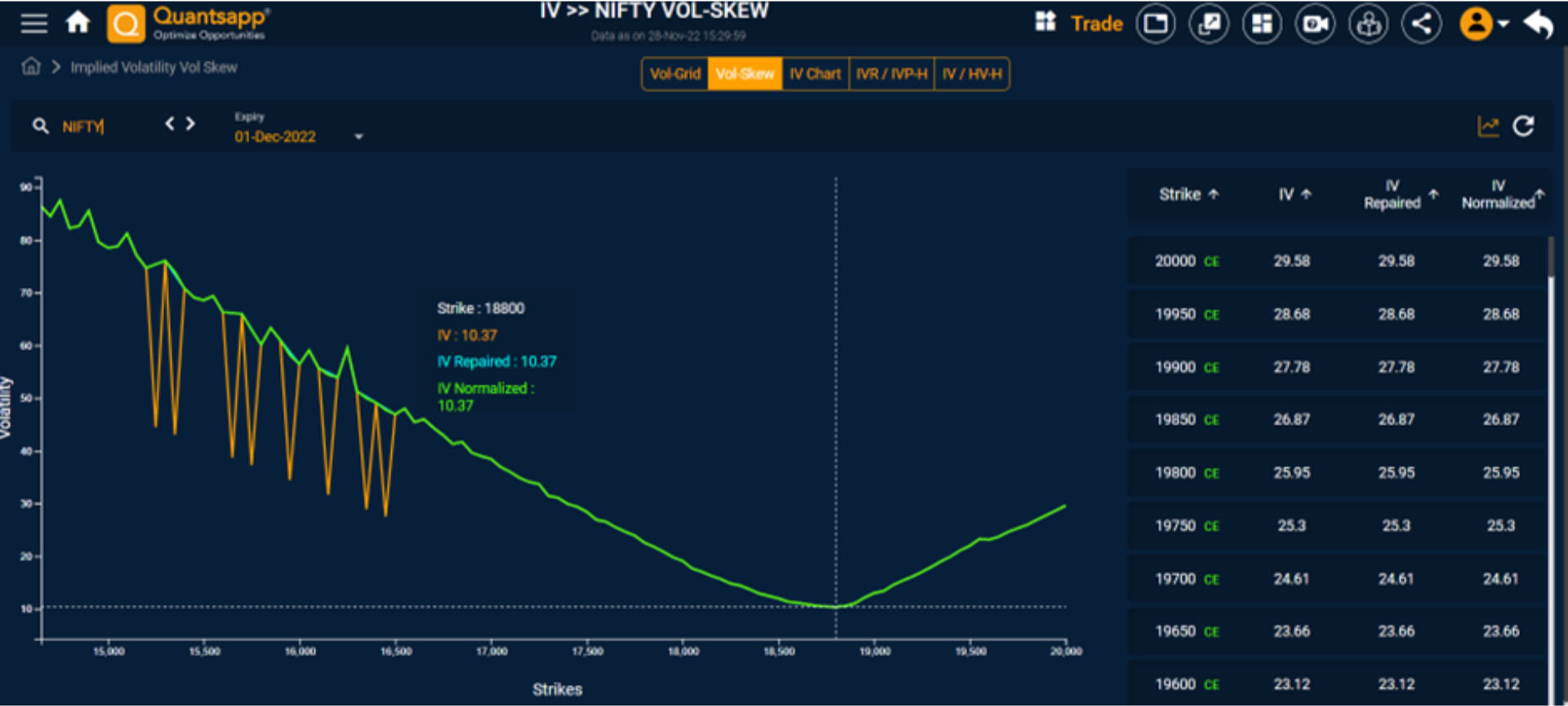 The Quantsapp volatility skew for NSE equity options, especially Nifty options is shown in the chart above. As mentioned earlier, the slope of the curve is steeper at lower strikes than the higher strikes. Quantsapp’s endeavour has been to provide cutting edge analytics in the Indian options market, to enable traders in their pursuit of being a data-driven trader.