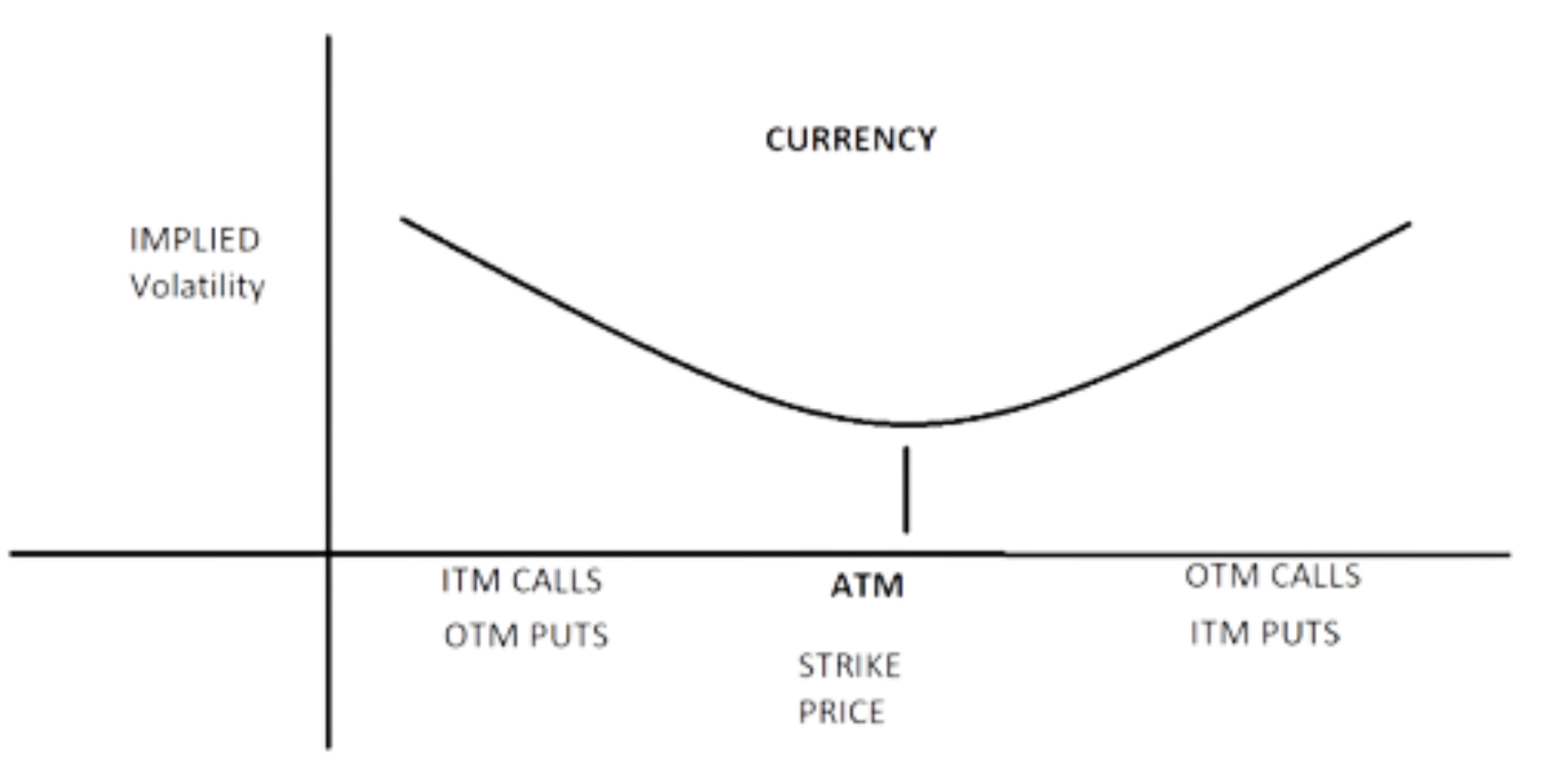 In the case of Currency options, implied volatility used to price options at the two extremes tend to be higher than the ATM strike options, as a sharp move in currency on either side (appreciative or depreciative) hurts either exporters or importers. Hence the volatility smile is more symmetrical in this asset class, as the intensity of destructive move is equal on either extreme. The causes of volatility smile in case of currency options is due to the moves in currency which are characterised by jumps, rather than continuous changes.