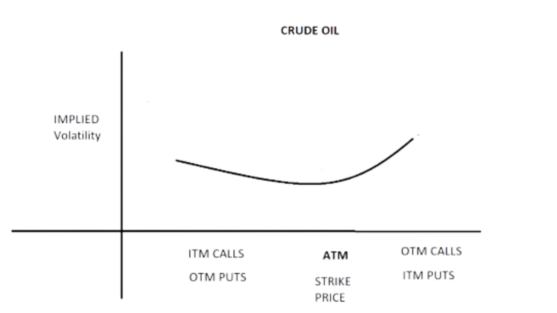 The crude oil options’ implied volatility smile and its curvature is significantly influenced by hedging pressure on the underlying. The scarcity premium which could emanate due to supply issues tends to keep the higher strike prices at a higher implied volatility than the left extreme. With the ATM volatility being the lowest point of the smile or, rather, volatility skew, causing the right side of the curve to be tilted above, in comparison to the left side of the curve surrounding the ATM.