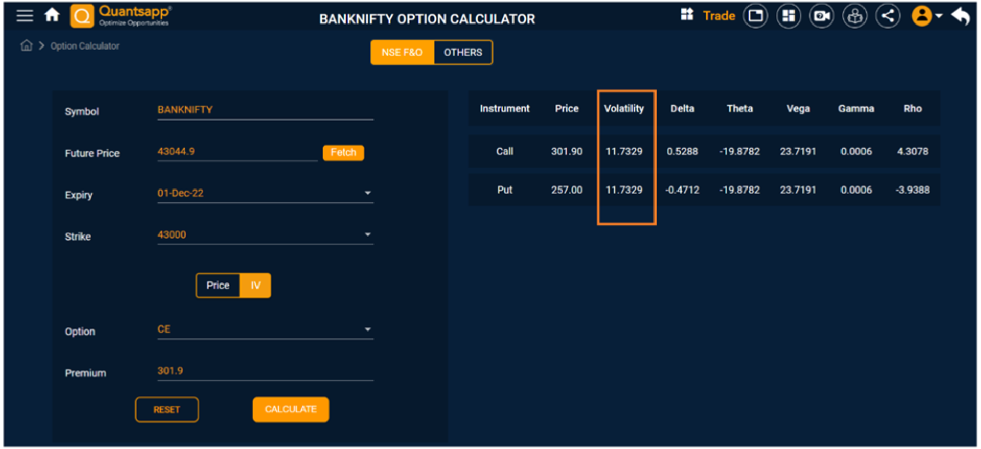 Implied volatility of BANKNIFTY 43000 1Dec2022 CE has been calculated using Quantsapp calculator. Option Greeks are also computed, which shall be discussed later.