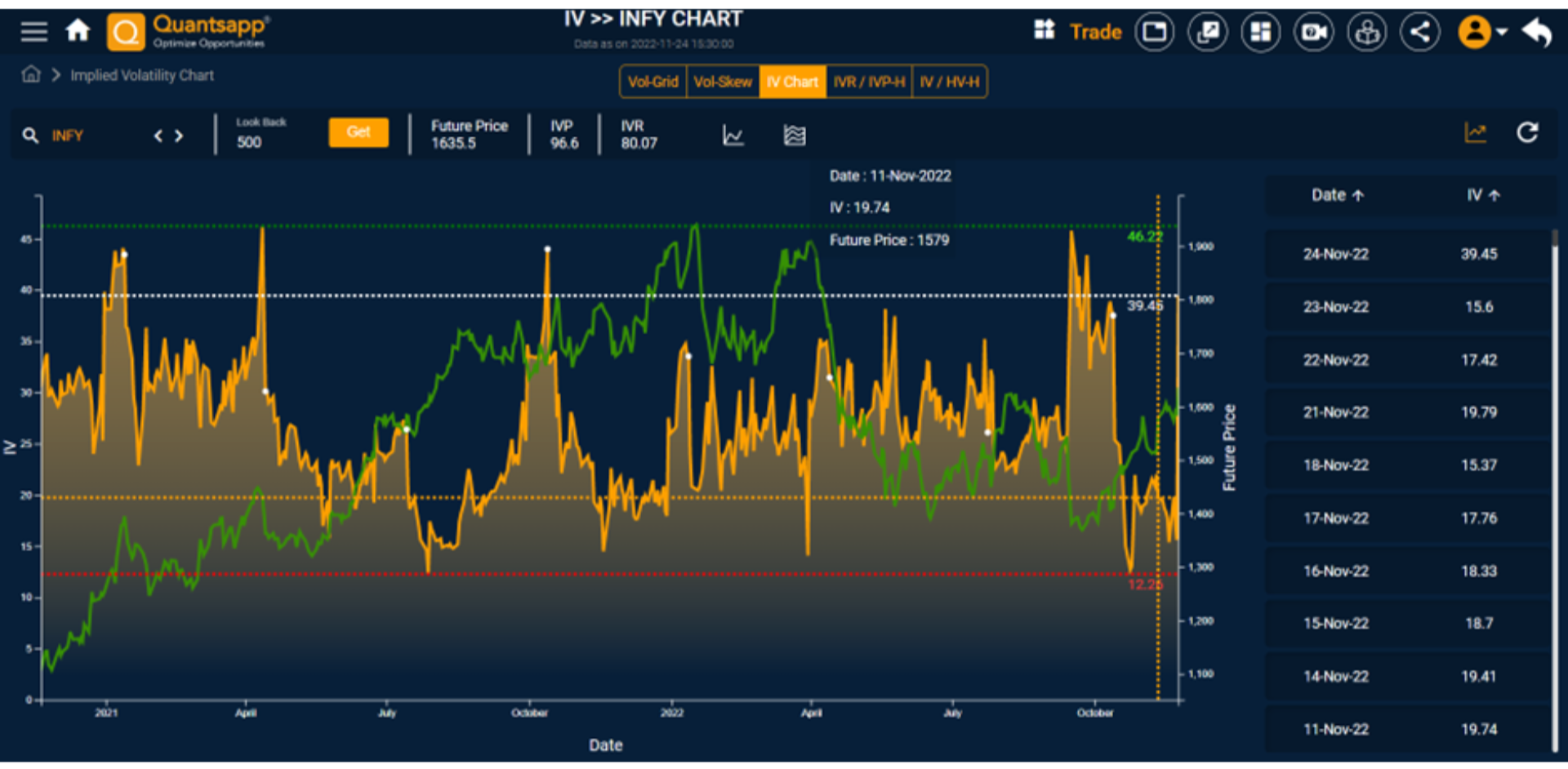Implied volatility is calculated from the market price of options, using the Black-Scholes option pricing model. Implied volatility for each F&O stock and Nifty/Bank Nifty can be easily observed in graphical as well as numerical form in Quantsapp’s IV suite.