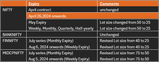 For FINNIFTY and MIDCP NIFTY, lot size will remain unchanged for existing monthly and weekly expirations for April, May, and June 2024 contracts. However, the monthly contracts in the July series of both indices will have a revised lot size.