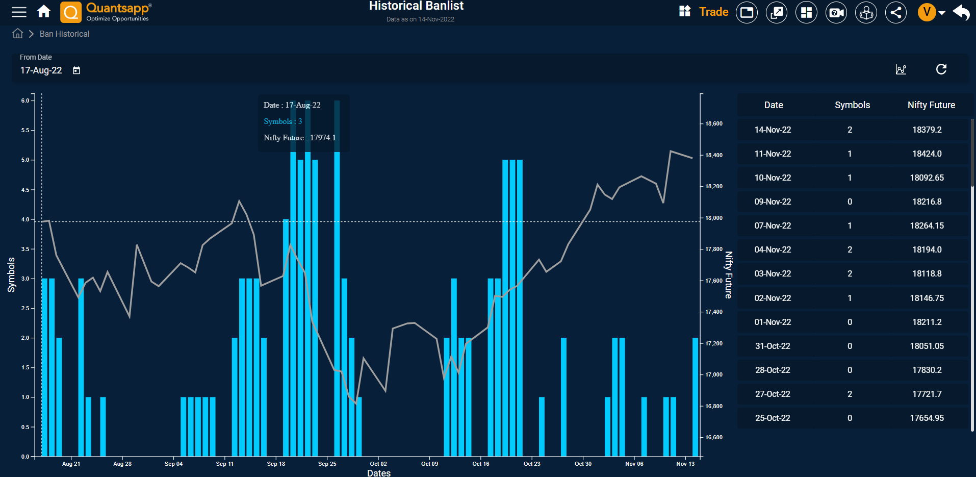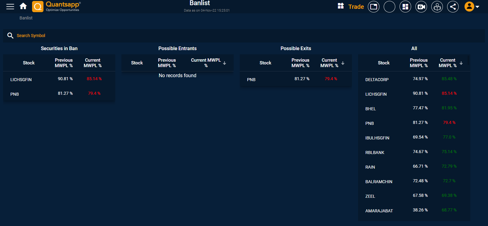 Daily at the end of day, NSE disseminates the aggregate open interest across all Indian Exchanges in the futures and options on individual scrips along with the market wide position limit for that scrip and tests whether the aggregate open interest for any scrip exceeds 95% of the market wide position limit for that scrip. If yes, the Exchange takes note of open positions of all positions as at the end of that day in that scrip, and from next day onwards the aforementioned scrip enters the Ban list. Traders should trade only to decrease their positions through offsetting positions till the normal trading in the scrip is resumed.