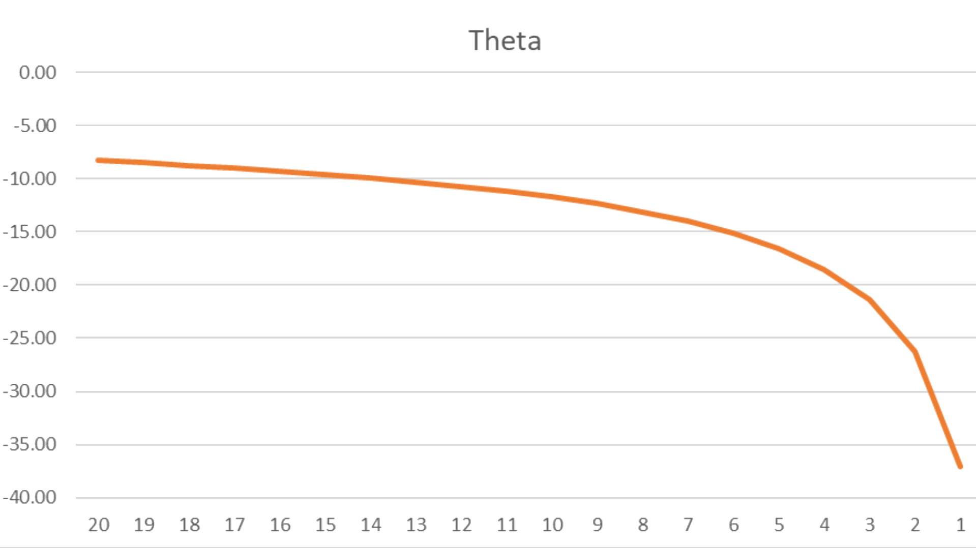 Options’ Theta measures the sensitivity of the value of the derivative to the passage of time or time decay. Option Greek, Theta, represents the sensitivity of the option's value to changes in time. A first order Greek, which is negative, means that the option's value will decrease as time passes, while a positive theta means that the option's portfolio will increase as time passes. Option Theta decay refers to the natural decrease in the value of an option as time passes and the option approaches expiration, assuming all other factors remain constant.