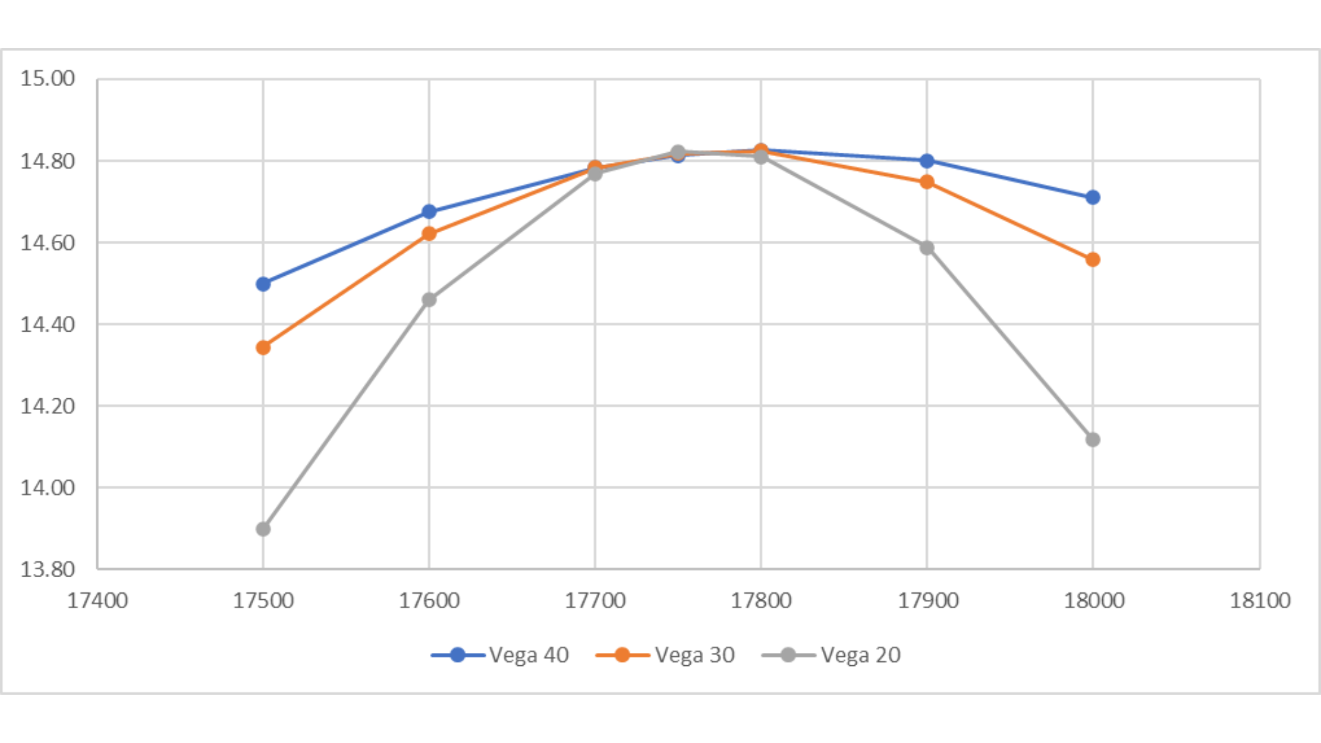 The chart ahead indicates the vega values for different implied volatilities, with vega 40 indicating Nifty option vega at 40% volatility, so on. Days to expiry for the option is 2 days, for ATM strike = 17750.