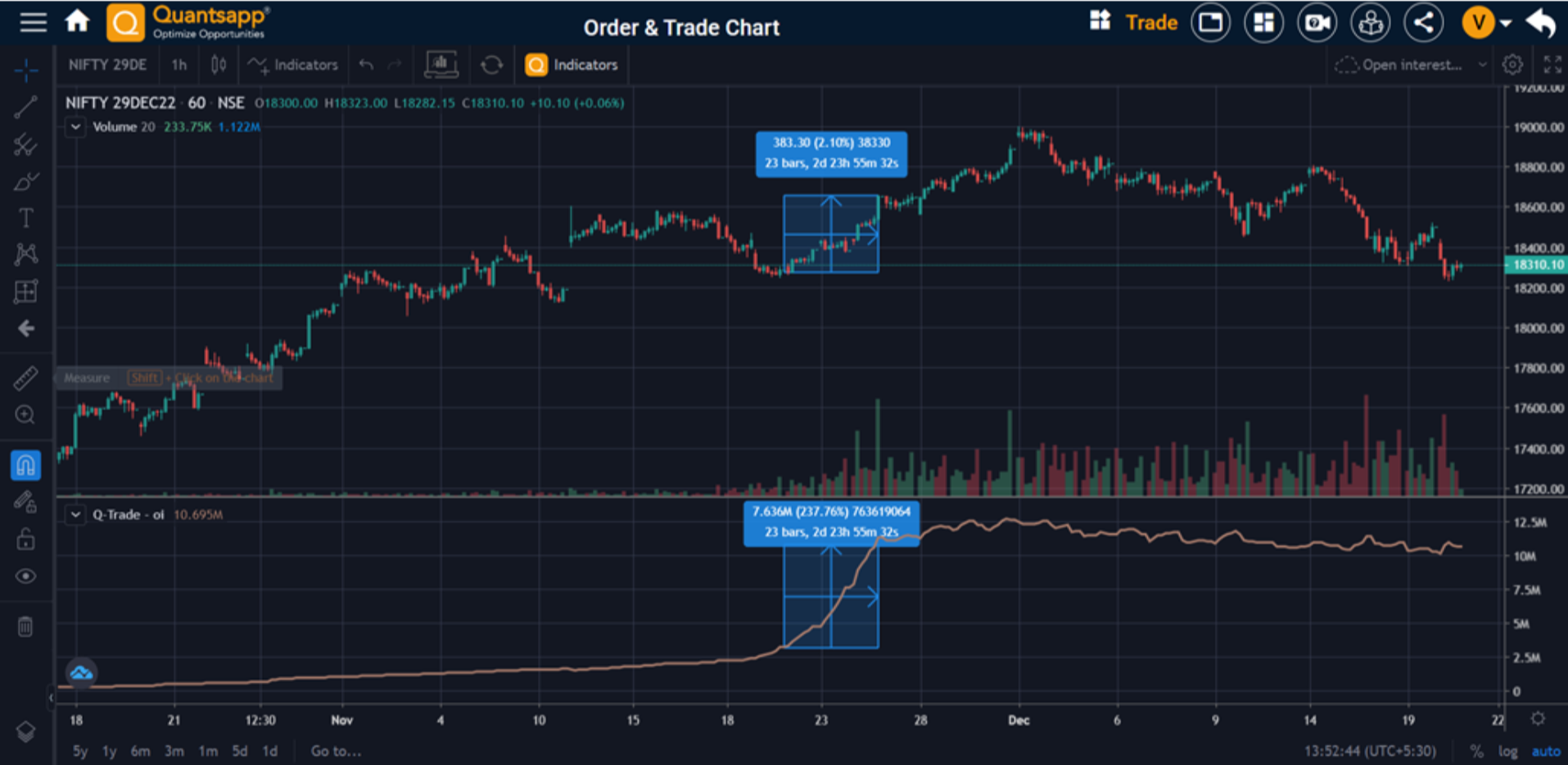 Open interest, as discussed in earlier module, indicates the number of outstanding or unsettled contracts of a particular derivative instrument. It is a metric or data point that helps gauge the traders’ participation in an underlying. Rising Open Interest points at rise in the trading interest in the underlying. So open interest can be tracked on live-basis in Quantsapp, both from the futures/underlying basis and also strike wise, in case of options.