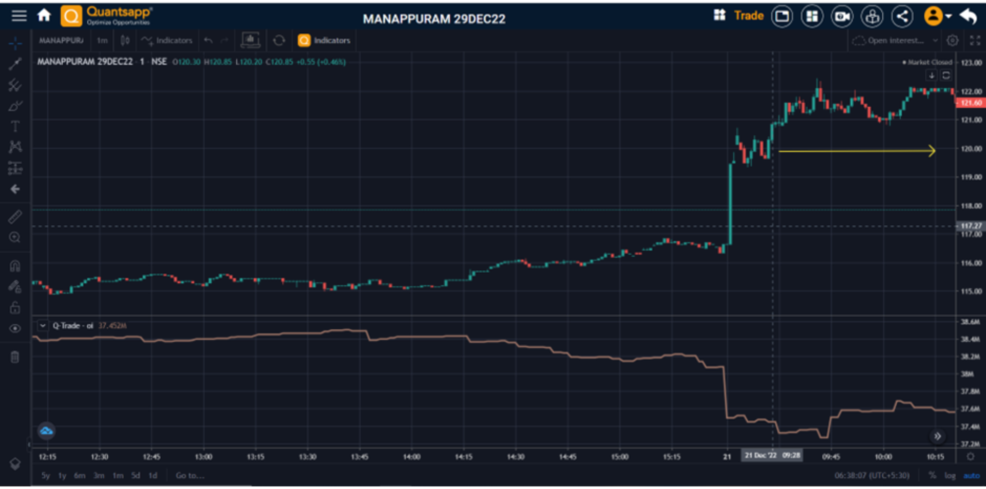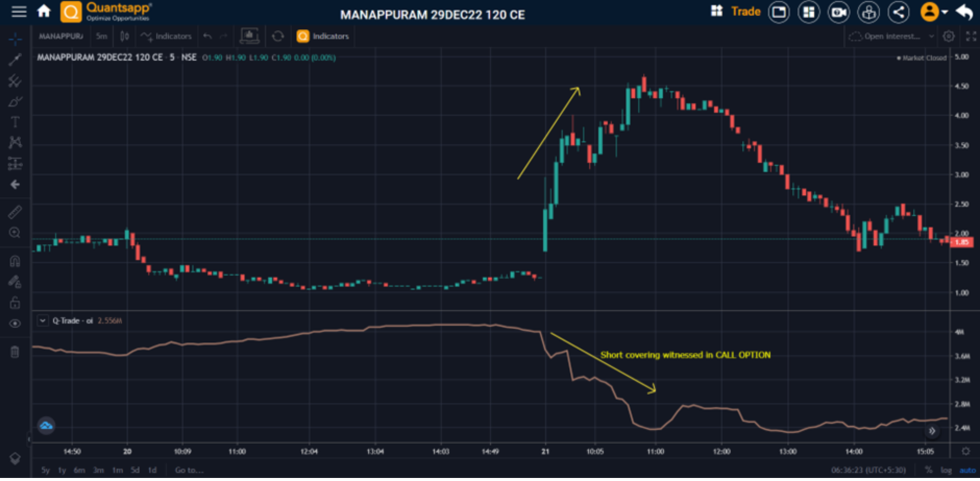 Manappuram quotes at about Rs 120 , 21st Dec 2022, at 9:20 am. The lower chart indicates as the prices of underlying inch higher, there comes a wave of short covering in 120 CE of Manappuram. This is where the Option sellers are trapped intraday basis and the option prices can move with a large swing to create wealth for the option buyers of Manappuram 29 Dec 2022 120 CE.