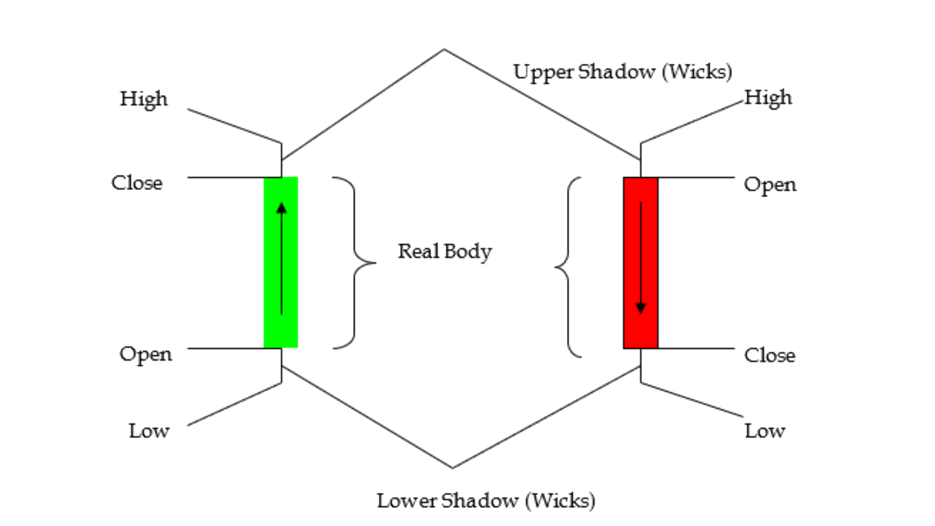A single candlestick indicates the opening and closing price, which represent the body and the high price of the period (1 day, if daily charts), is indicated by a wick on the upper side and low price of the time period is indicated by the bottom of the wick on the lower side.