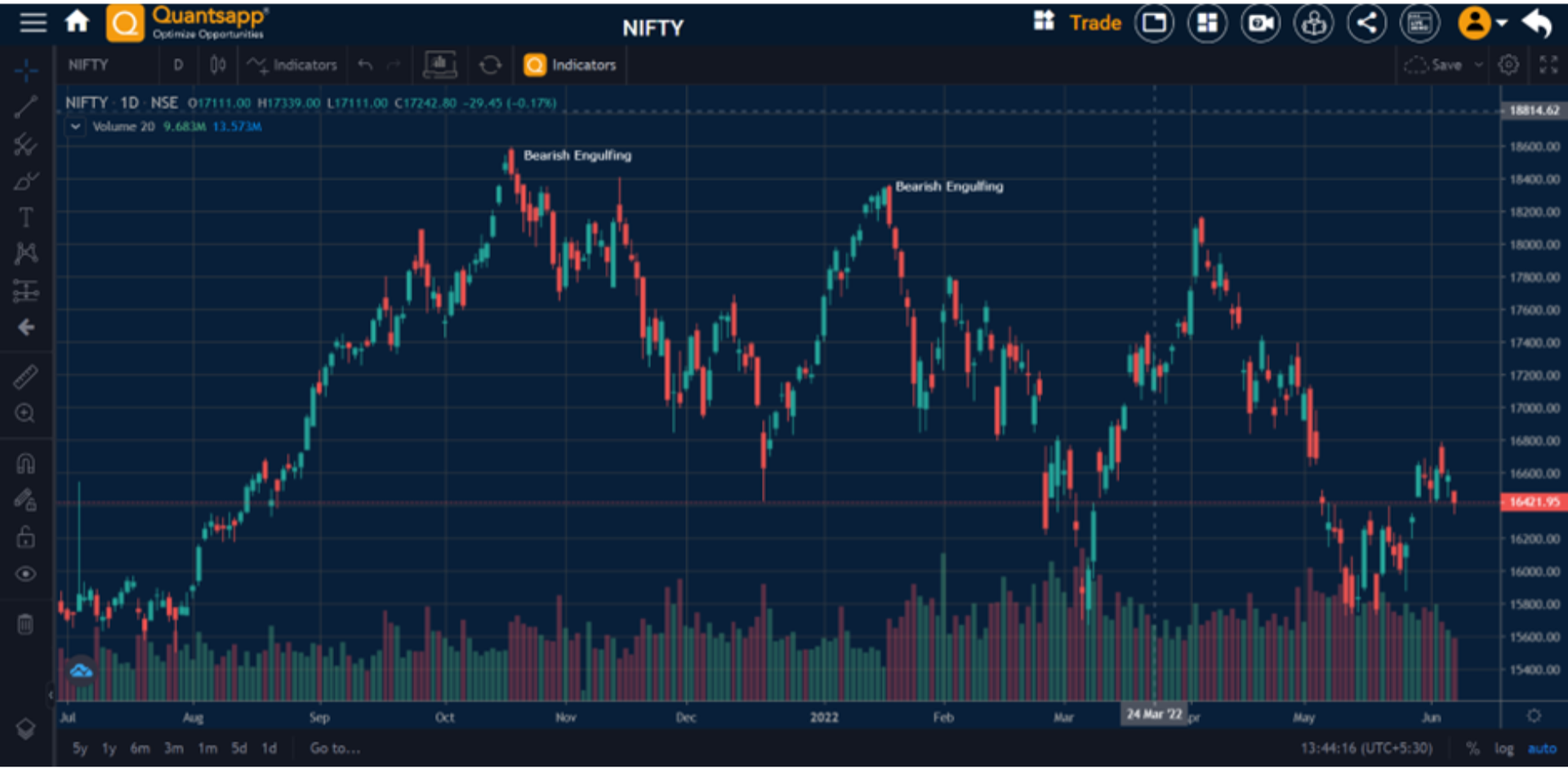 Nifty chart showing bearish engulfing candles and a trend reversal post, formation of the requisite pattern.
