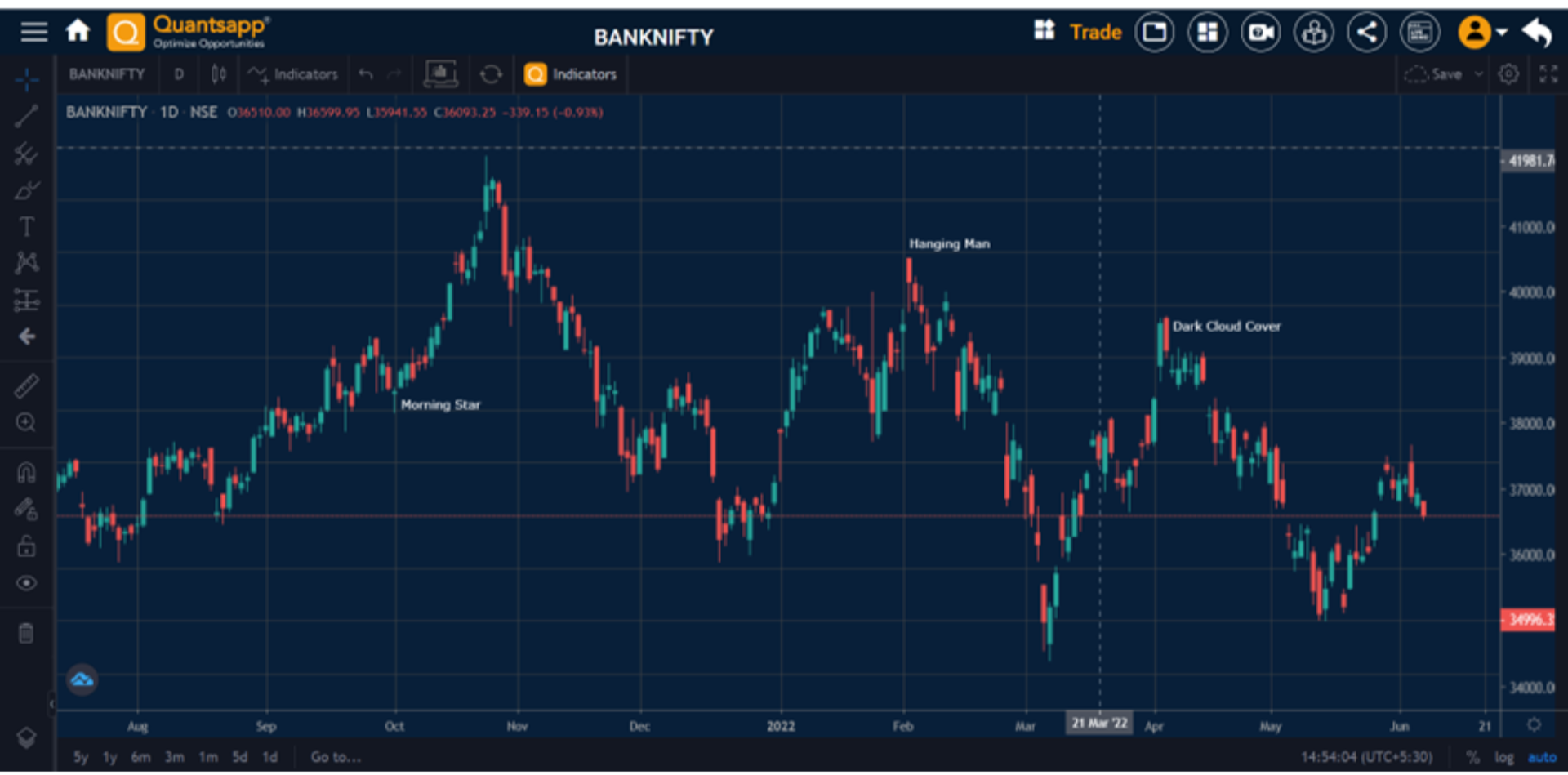A variety of candle stick patterns visible on BankNifty chart on Quantsapp.